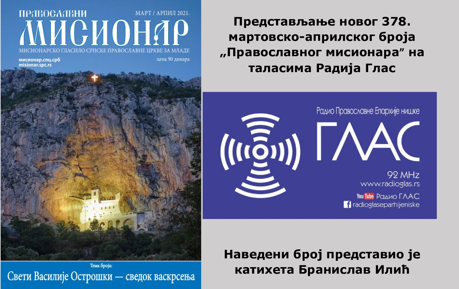 Из штампе је изашао нови мартовско-априлски 378. број "Православног мисионара", званичног мисионарског гласила Српске Православне Цркве за младе. Тема овог броја је "Свети Василије Острошки - сведок Васкрсења". Централни део наведеног броја је посвећен 350-годишњици упокојења Светог и богоносног оца нашег Василија чудотворца Острошког. О садржају овог броја говорио је катихета Бранислав Илић, члан уређивачког одбора "Православног мисионара" задужен за односе са медијима.